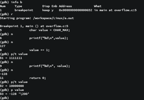 각 줄을 실행해보며 overflow 전 후의 value 변수의 값을 2진수로 확인한다. value 값의 변화는 다음과 같다.